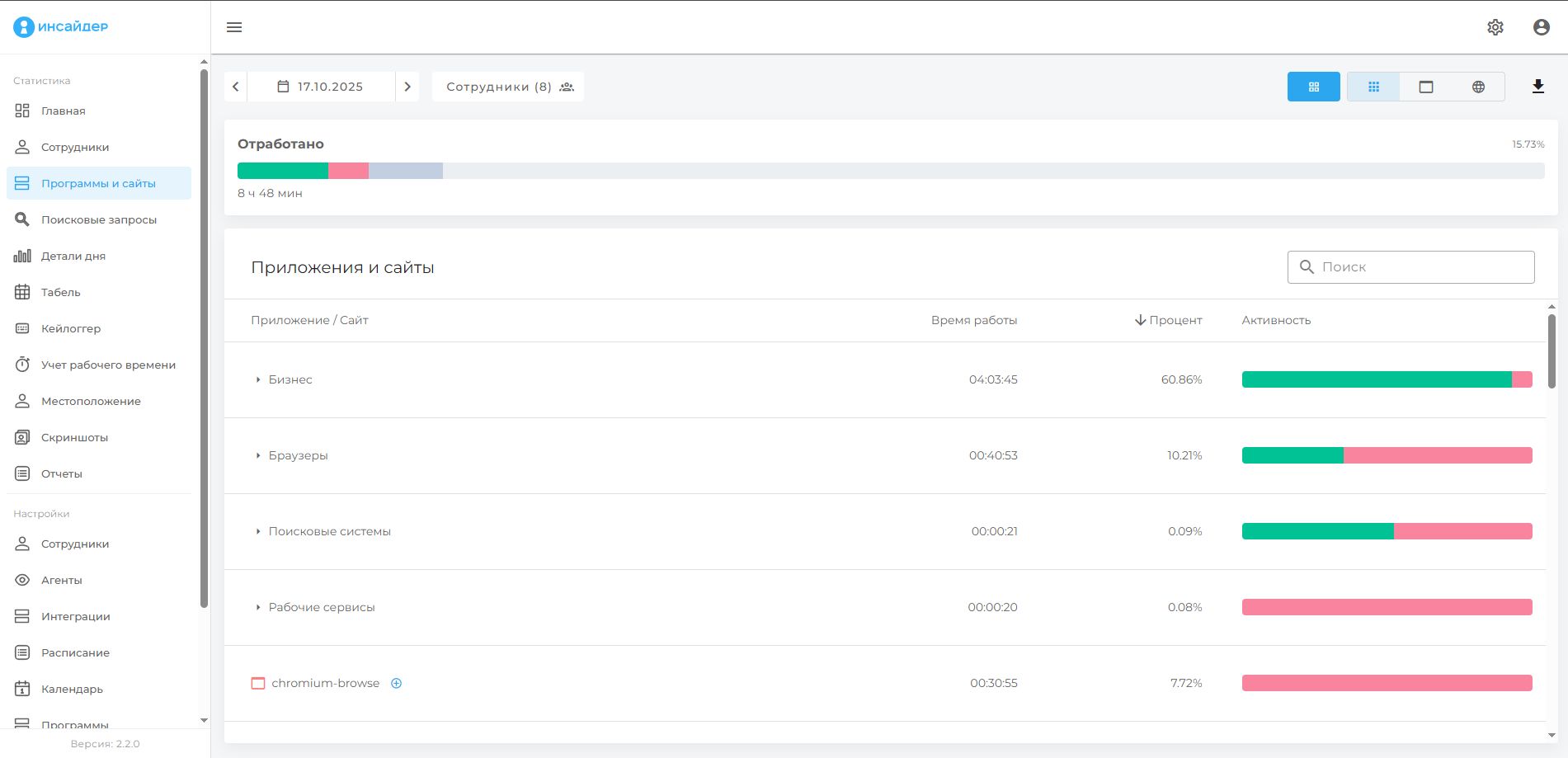 Отчет показывает все программы и сайты, которыми пользовались сотрудники в течение рабочего времени.