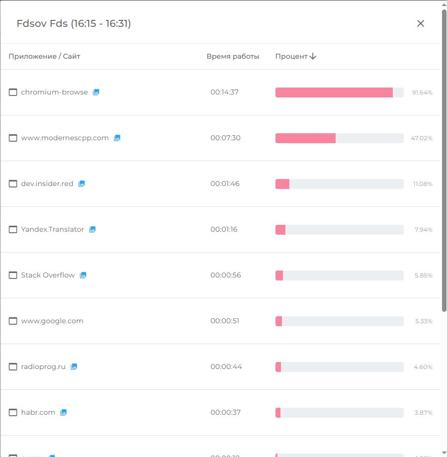При клике в окне открывается отчет по программам и сайтам, использовавшихся выбранным сотрудником.