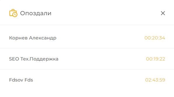 Показывает всех сотрудников, у которых было зафиксировано опоздание. По сотруднику показывается ФИО, отдел, должность и период опоздания.