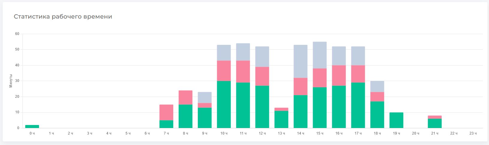 Продуктивность по периодам - показывает динамику продуктивного времени по периодам в зависимости от выбранного периода в фильтре. При выборе периода “День” виджет покажет разбивку по часам, “Неделя” - по дням, “Месяц” - по дням и “Год” - по месяцам.