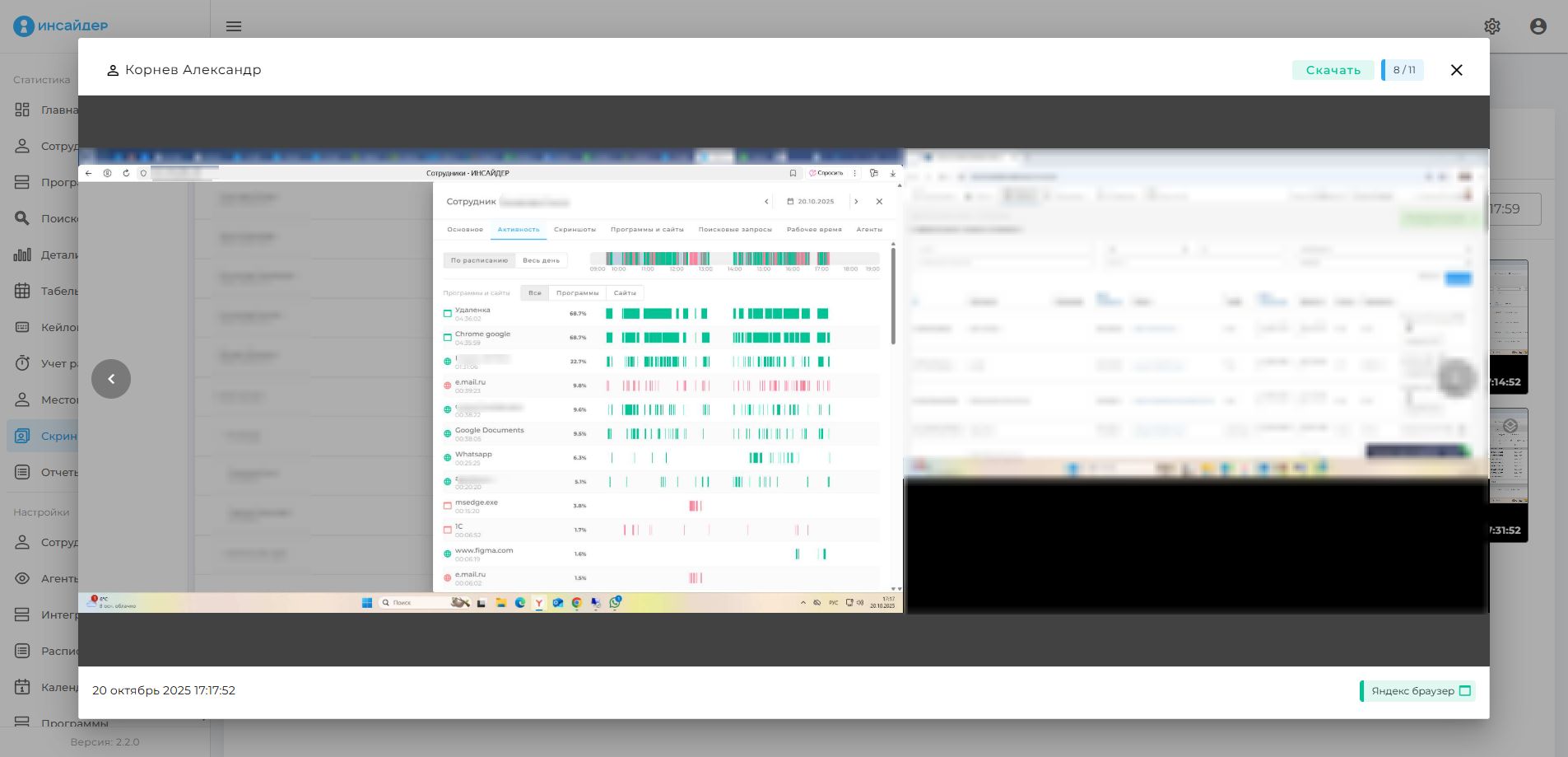 При клике на скриншот открывается окно увеличением скриншота, ФИО, должностью и отделом сотрудника и используемой программой во время снятия скриншота.