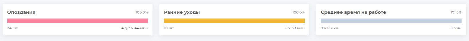 Показывает среднее время на работе (среднее количество часов, отработанных за рабочий день в указанный период), Количество опозданий за указанный период, количество ранних уходов за указанный период.